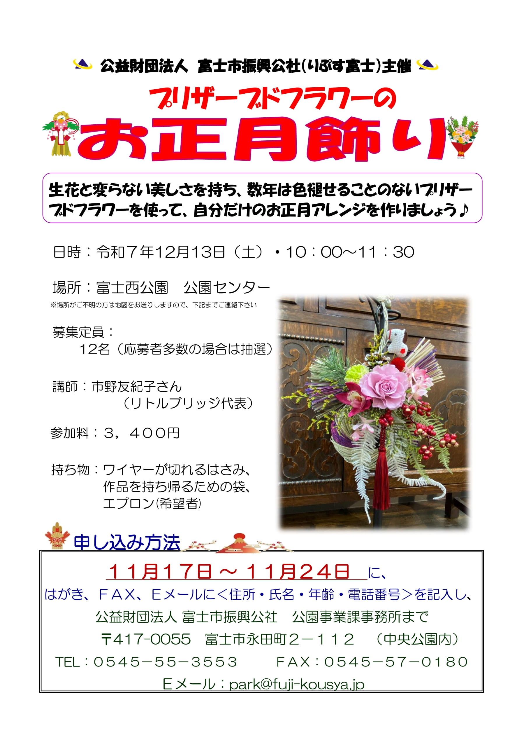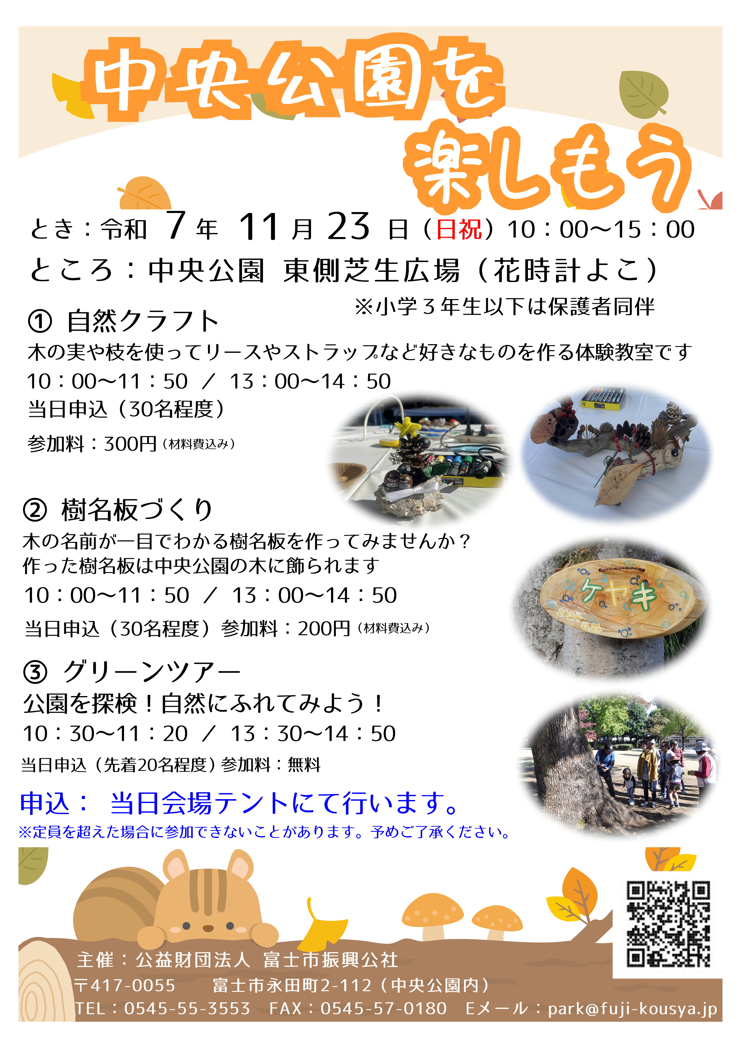 | 〒417-0055 富士市永田町2-112 富士市振興公社 公園事業課(中央公園内) ☎:0545-55-3553 FAX:0545-57-0180 E-mail:park@fuji-kousya.jp |
